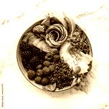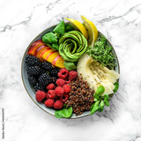 Fresh summer salad with quinoa, peach, micro greens, avocado, raspberries, blackberries, coconut, melon on light marble background. Healthy food, clean eating, Buddha bowl salad, detox, top view