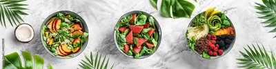 Fresh summer salad with quinoa, peach, micro greens, avocado, raspberries, blackberries, coconut, melon on light marble background. Healthy food, clean eating, Buddha bowl salad, detox, top view