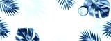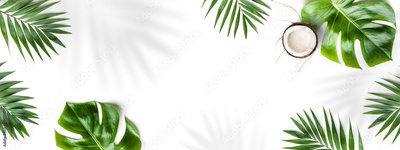 Tropical leaves, Monstera plants and coconut isolated on white background. Summer concept, leaf shadows, flat lay, top view