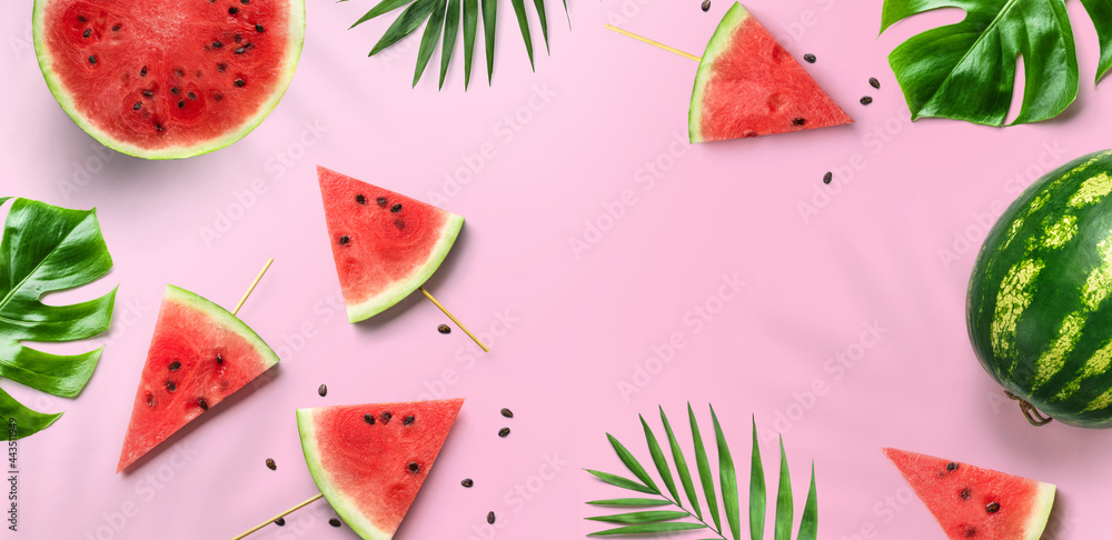 Summer trendy bright watermelon pattern layout. Red watermelon slices, tropical leaves, monstera plants and leaf shadows on pink background, flat lay, top view