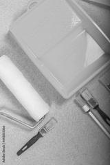 Tools for wall painting and repair: roller, brushes, yellow paint tray