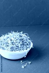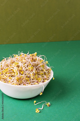 Bowl with radish sprouts on modern green background. Sprouted seeds. Healthy eating, detoxification.