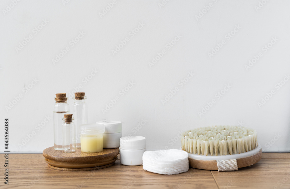 Reusable cosmetics with refill packing. Sustainable business, eco-friendly circular economy. Glass bottles, small reusable bottles for cosmetics