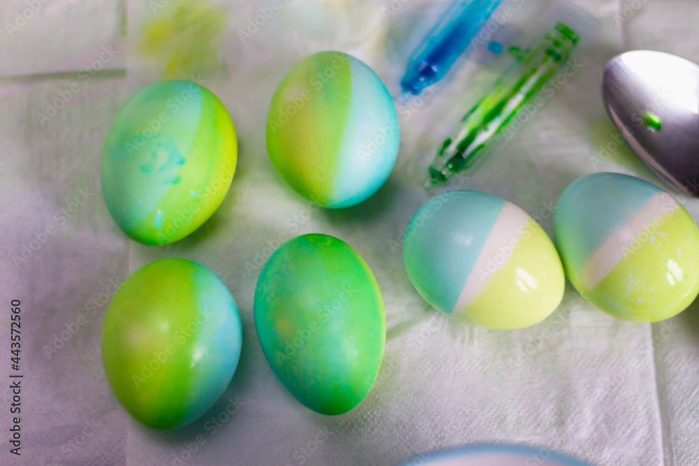 Coloring Easter eggs with liquid dyes in green and blue colors before the celebration of Easter