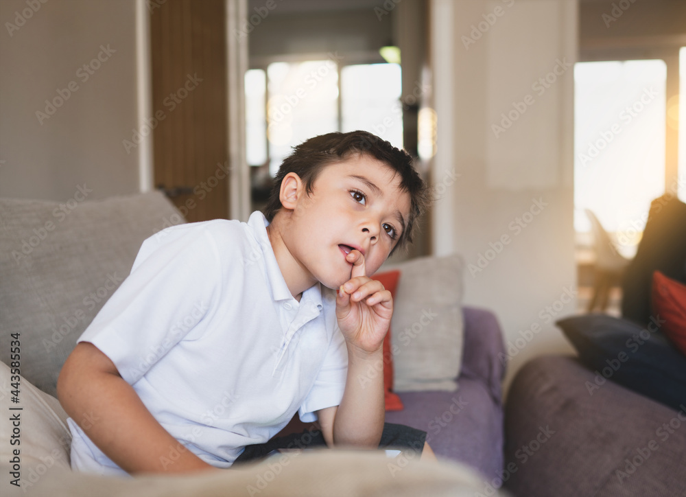 Cinematic portrait young boy biting finger and looking out with thinking face. Emotional Child deep in thought with a hand on lips, School kid sitting alone in living room after back from school.