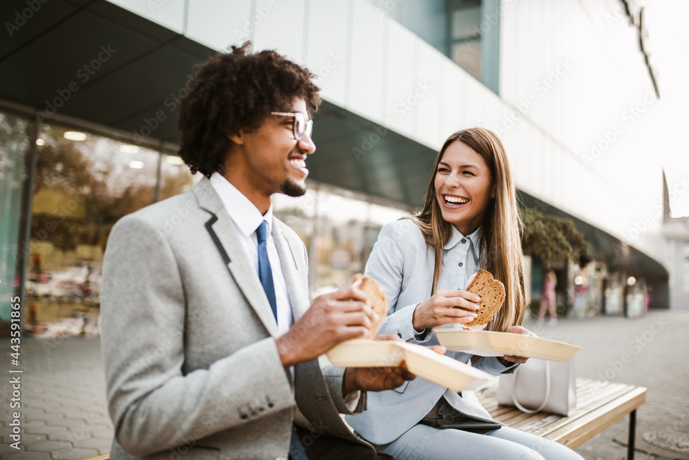 Smiling businessman and businesswoman with sandwiches sitting in front of the office building - lunch break