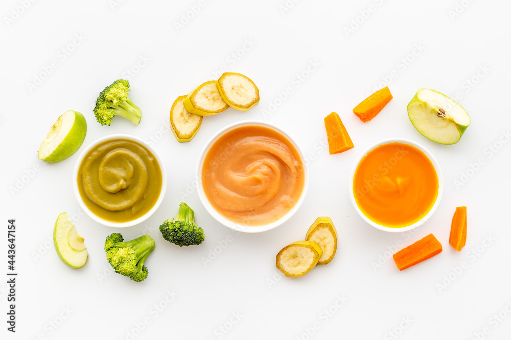 Baby fruit vegetables food - mousse in bowls with fresh vegetables and fruits
