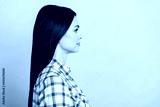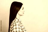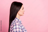 Profile side view portrait of lovely content girl wearing checked shirt copy space isolated over pink pastel color background
