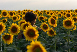 Happy child boy in yellow garden of sunflowers. The boy in sunflowers. Kids happiness concept