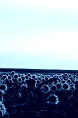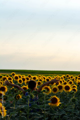 Happy young boy in sunflower field holding her hands up. Freedom concept. Happy boy in a field of sunflowers, back view, vertical.