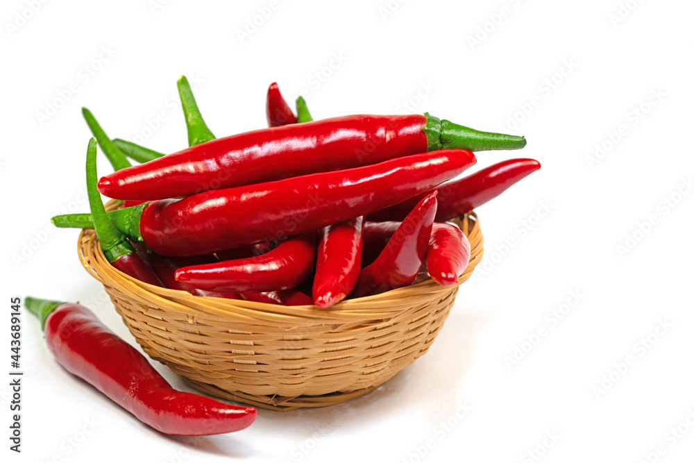 Peperoni, Capsicum annuum, im Körbchen, isoliert vor weißem Hintergrund