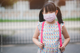 Portrait of asian girl wearing backpack and covid-19 protective face mask ready for elementary school. Concept of back to school