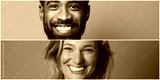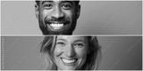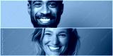 Beautiful and happy commercial man and woman in front of a colored background