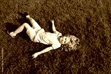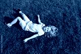 Happy smiling boy relaxing on the grass. Top view with copy space.