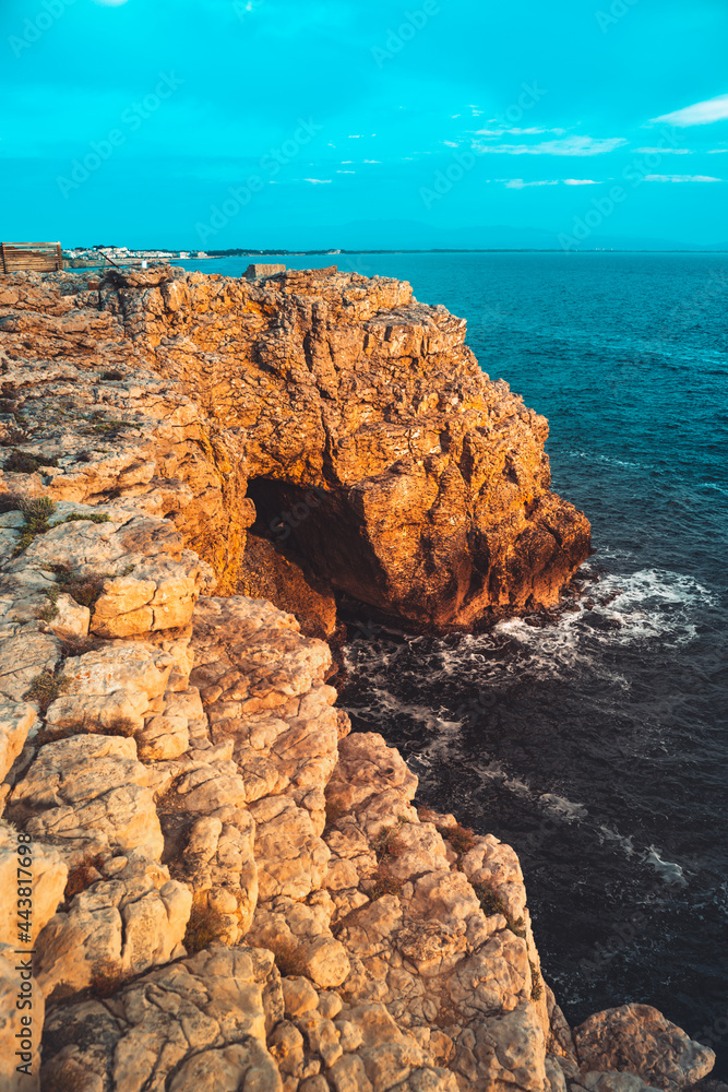 Amazing colorful sky sunrise above mountains cliffs and deep blue ocean.