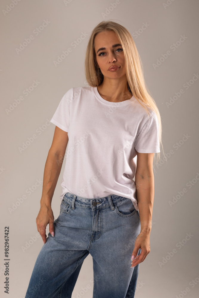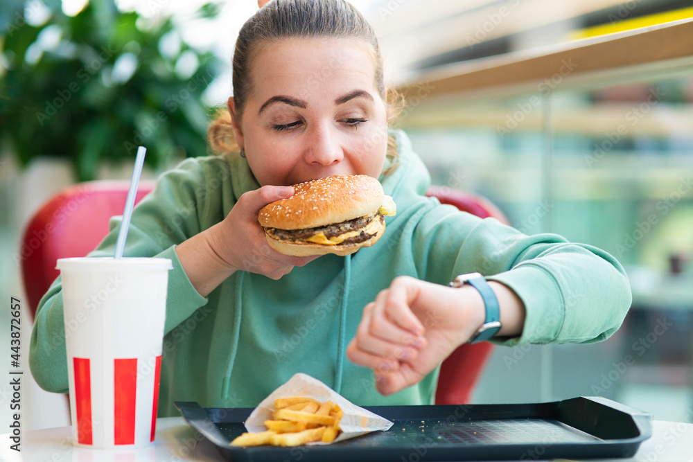 Nervous stressed hungry girl, woman in hurry, rush biting, eating big burger, fries and soda looking at watches, checking time. Love fast junk food. Unhealthy lifestyle. Getting fat, overeating