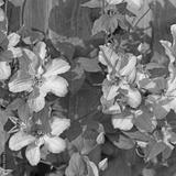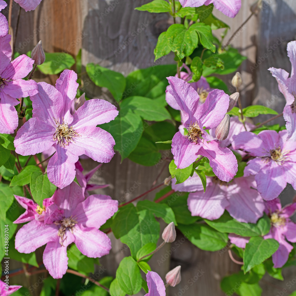 Violett blühende Waldrebe, Clematis, an einer Holzwand
