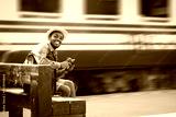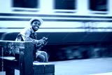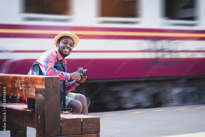 African male traveler waiting for the train on railway station. Adventure travel concept