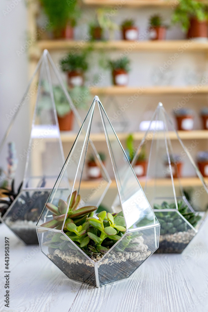 Modern art decor interior composition succulents in glass florarium on wooden table at workshop