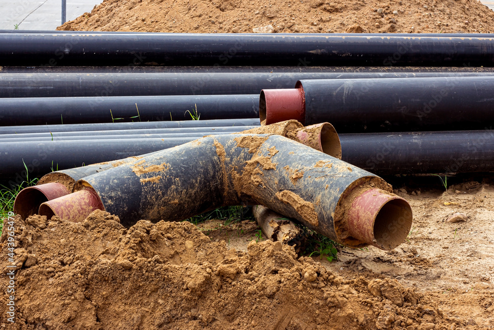 Installation of the distribution unit of heating and water supply network. Frame for connecting pipes in the trench of ground.
