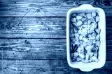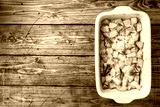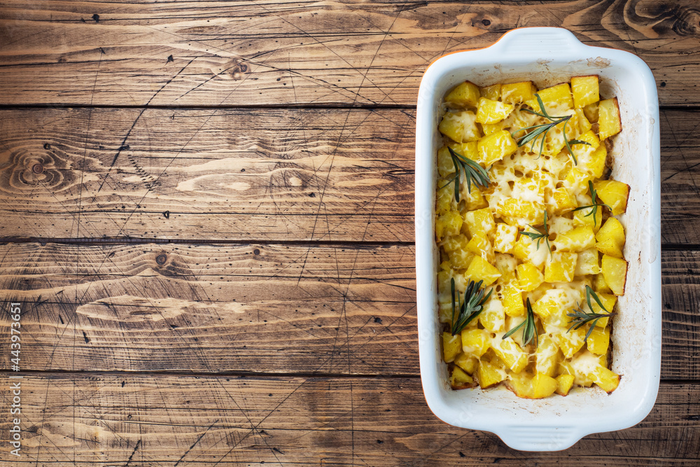 Delicious baked potatoes with spices cheese and rosemary in a ceramic baking tray on a wooden rustic background. Copy space
