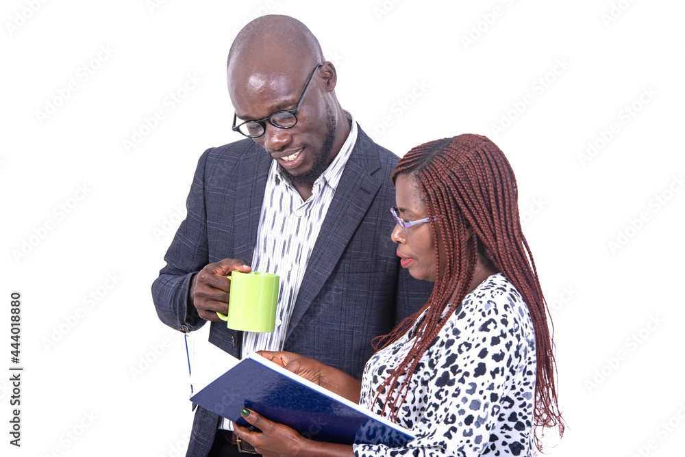 Serious adult businesspeople checking notes together in document.