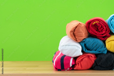 close up of rolled colorful t shirt clothes on wooden table with green background