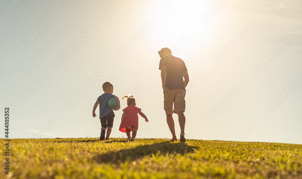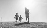 Happy father and his children running together in a open field.