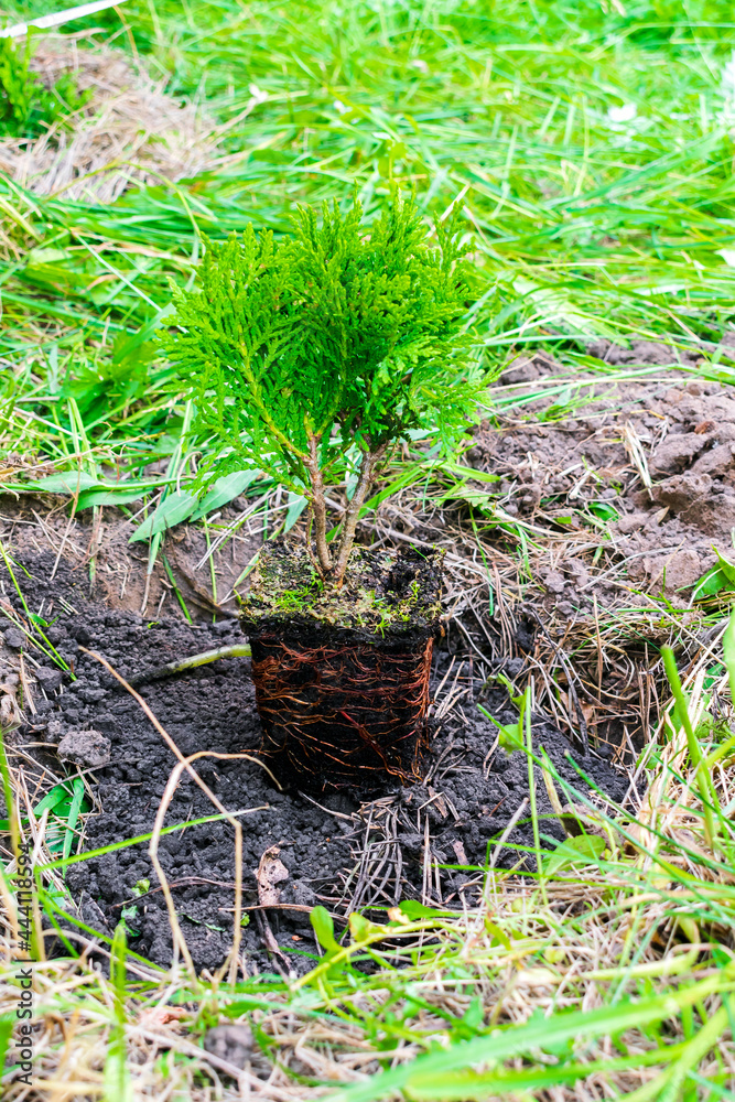 green little coniferous tree plant sprout from pot with soil, ground on grass nature background preparing to plant in garden, forest, park. Eco friendly, organic, ecology concept