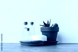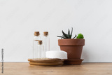 Three glass bottles with cork stopper on wooden podium with white wall background. Essential oil refilling store. Mockup template.