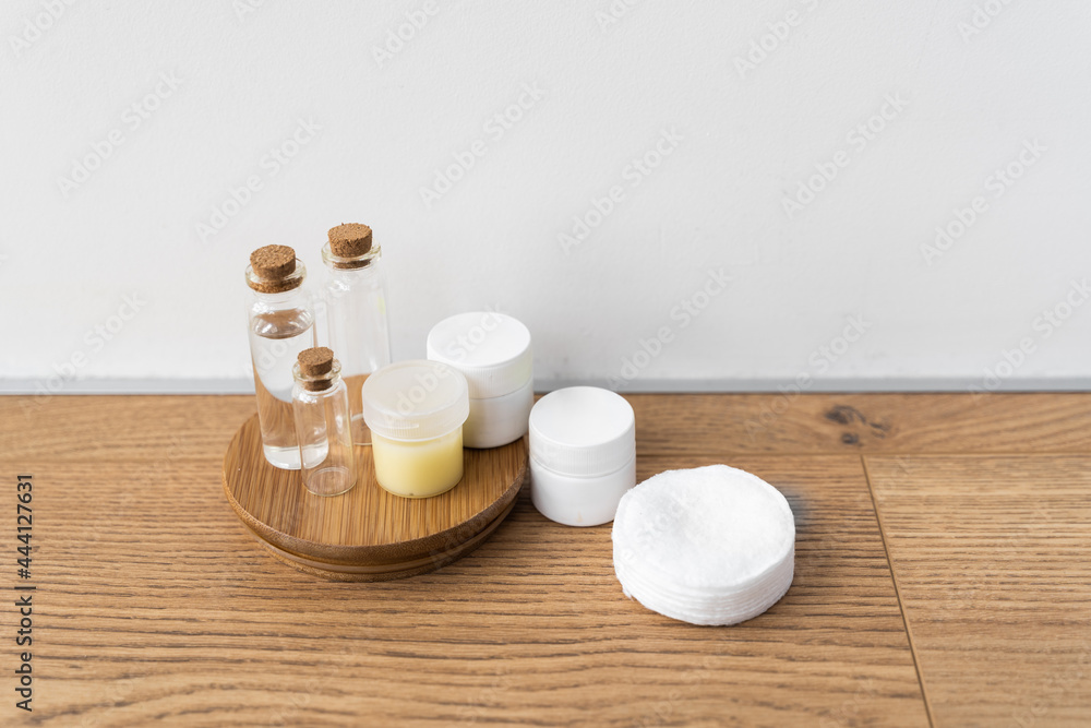 Reusable cosmetics with refill packing. Sustainable business, eco-friendly circular economy. Glass bottles, small reusable bottles for cosmetics