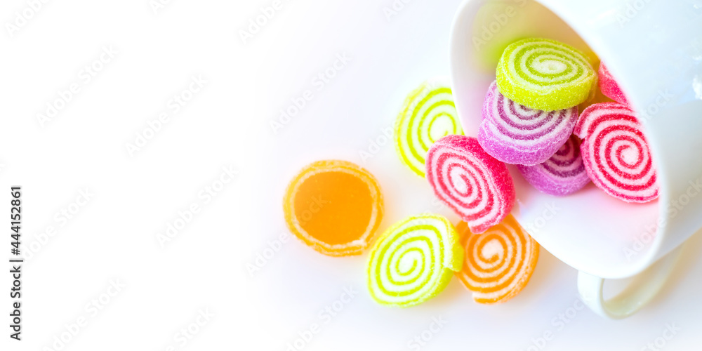 colorful sweets and sugar candies on a white background