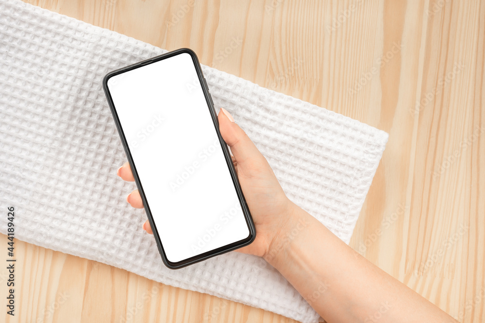 hand hold mockup cell phone with blank screen on natural wooden table and white waffle towel for spa treatments.