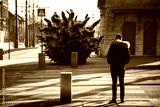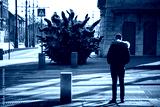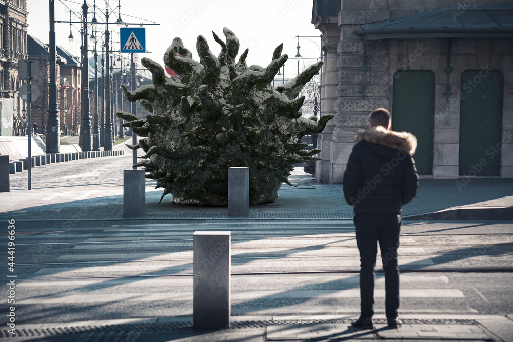 A guy standing on pedestrian crossing in front of giant virus molecule. Pandemic concept
