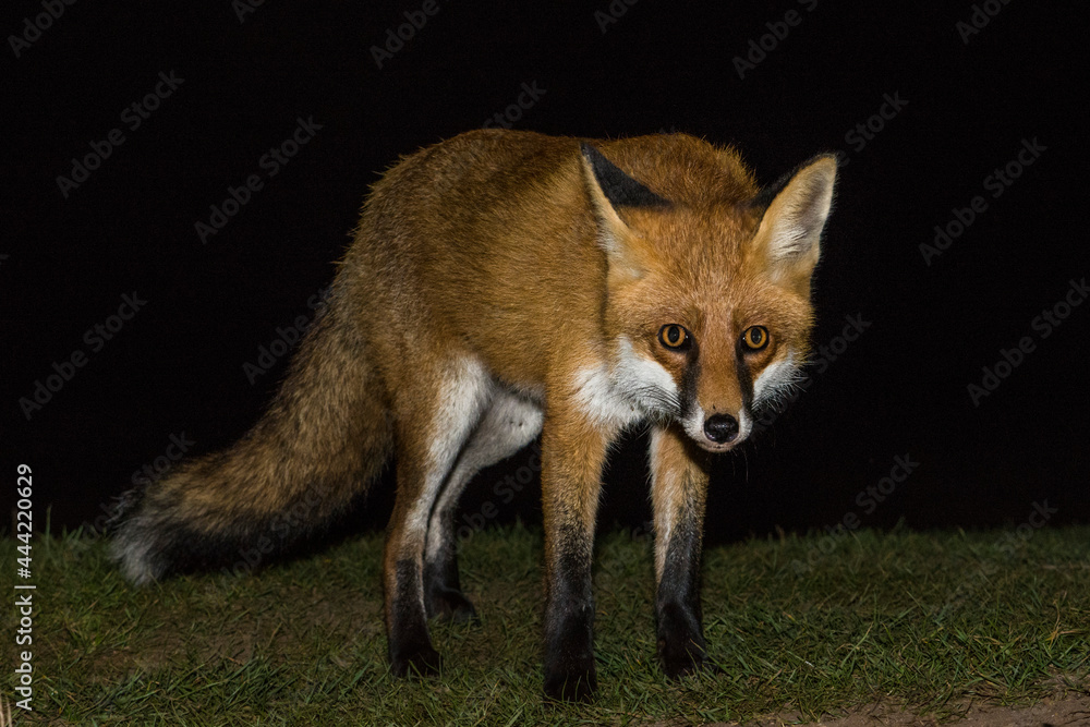 Red fox, Vulpes vulpes, standing in the grass in the night, Biebrza national park.
