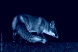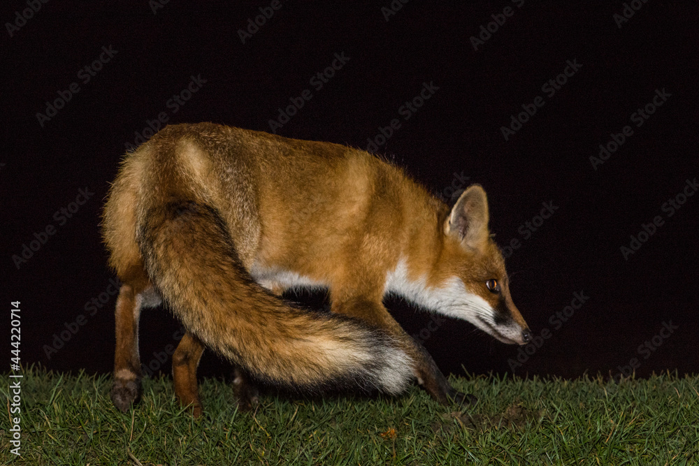 Red fox, Vulpes vulpes, standing in the grass in the night, Biebrza national park.