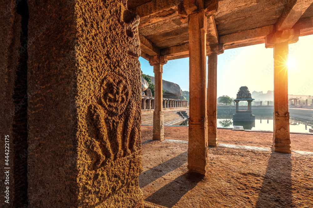 View of sunrise at Pushkarni, Sri Krishna tank in ruins. Hampi, karnataka, India.