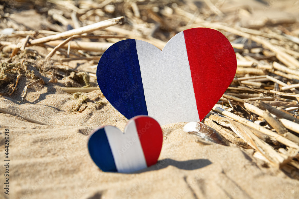 two wooden hearts big and small painted in colors of flag of France blue, white and red lies on golden sand of beach, selective focus