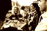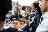 People enjoying a beer together at pub brewery - Happy laughing man and women talking and raising pint glass - Lifestyle and drink concepts in London