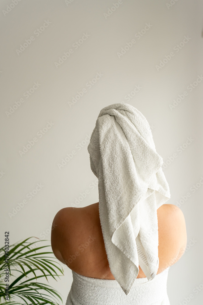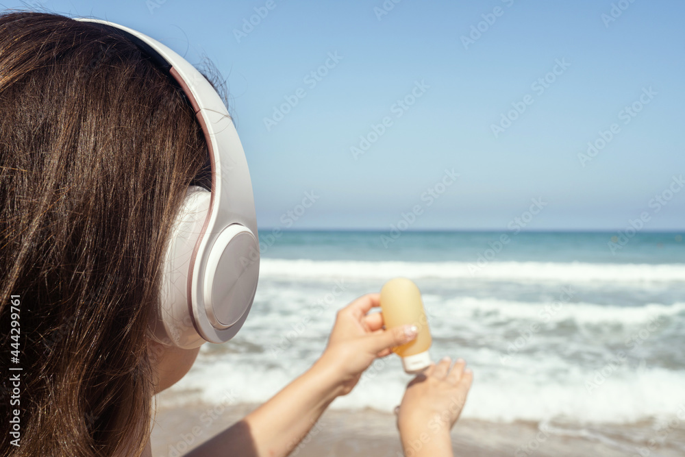 Woman in headphones listen music applying sunscreen on skin on a beach looking on the sea. Female relaxation at summer vacation. Back view