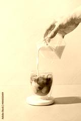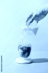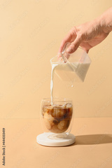 Pouring milk in coffee with ice cube on modern beige background. Vertical format. Iced latte coffee on modern still life.