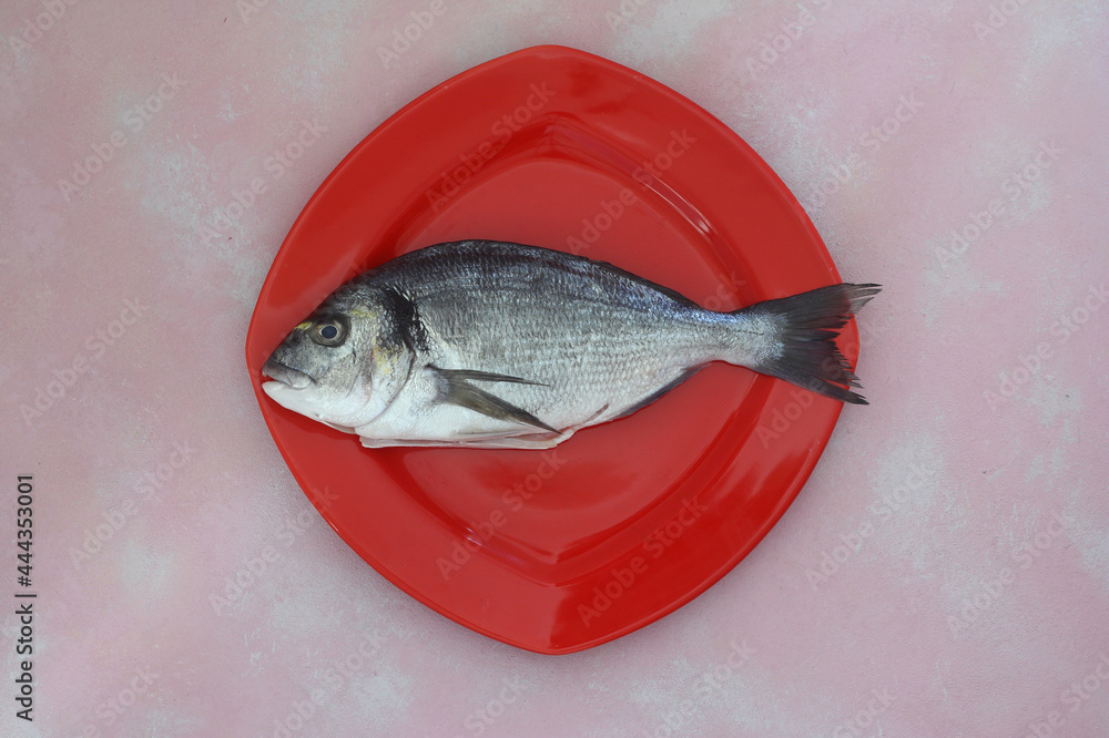 fresh fish on a pink wooden board. Raw uncooked sea bream on red plate.