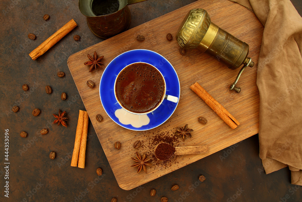 Coffee beans and ground coffee in wooden spoons on brown background. With coffee pot, blue coffee cup and coffee grinder.