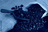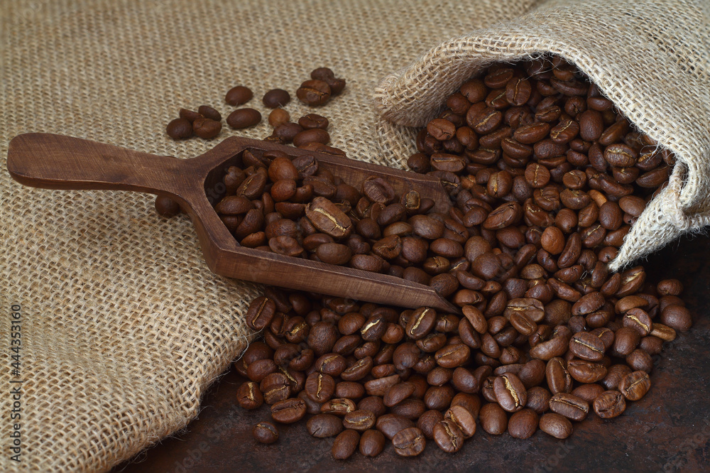 Roasted coffee beans close-up in wooden scoop on background burlap sack, selective focus