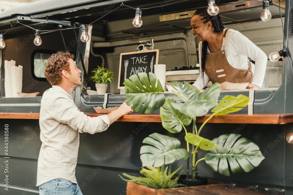 African chef woman taking order from customer at food truck outdoor - Focus on man face