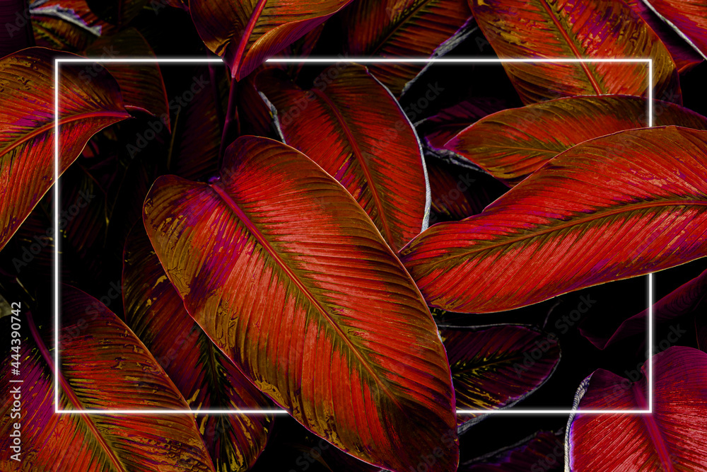 tropical red leaves and palms with white paper note frame, nature flat lay concept