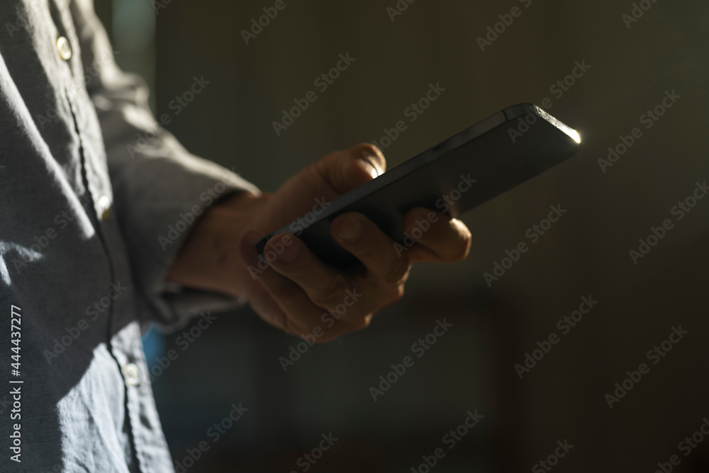 Close-up of man using mobile phone for searching information in internet. Persons hand holding smartphone on dark background.