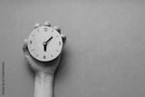 Hand of woman holding retro alarm clock on green table background, vintage style