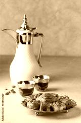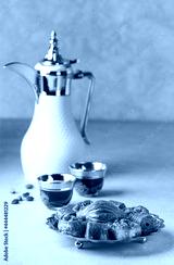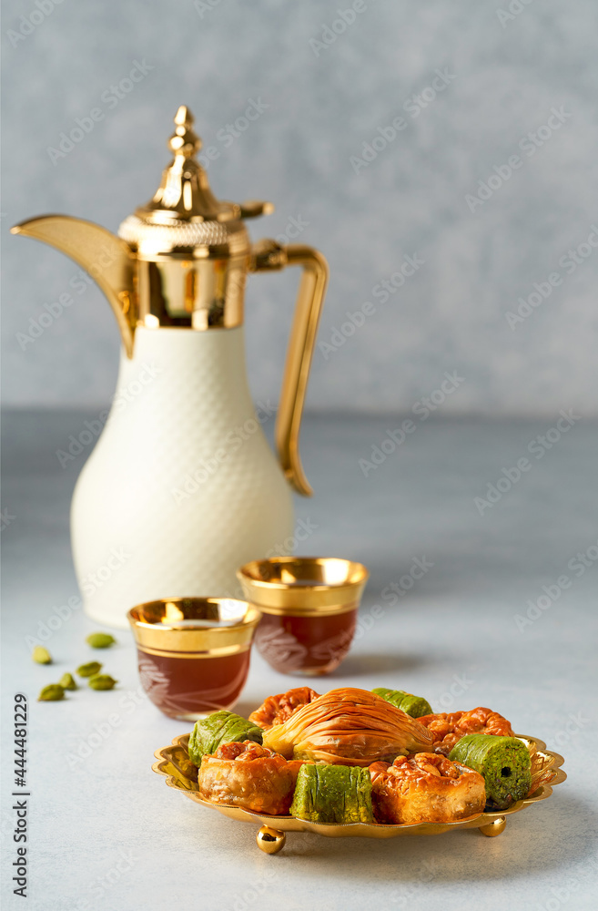 Baklava sweets with Arabic Coffee pot Dallah and cup of traditional cardamon coffee Qahwa