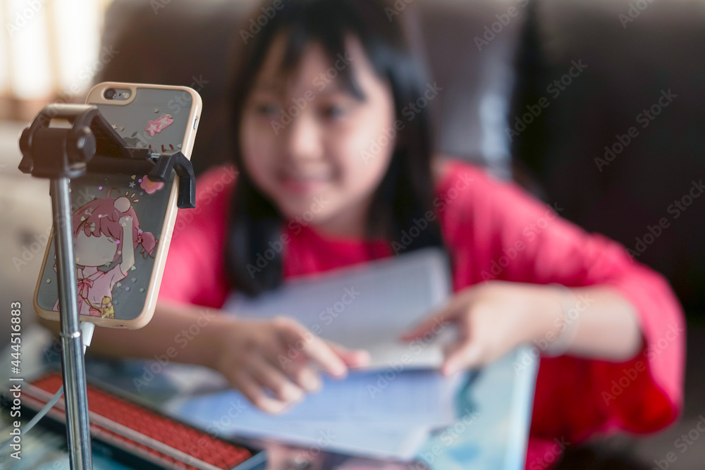 Asian little girl studying online at home, looking at phone screen with smile and happy